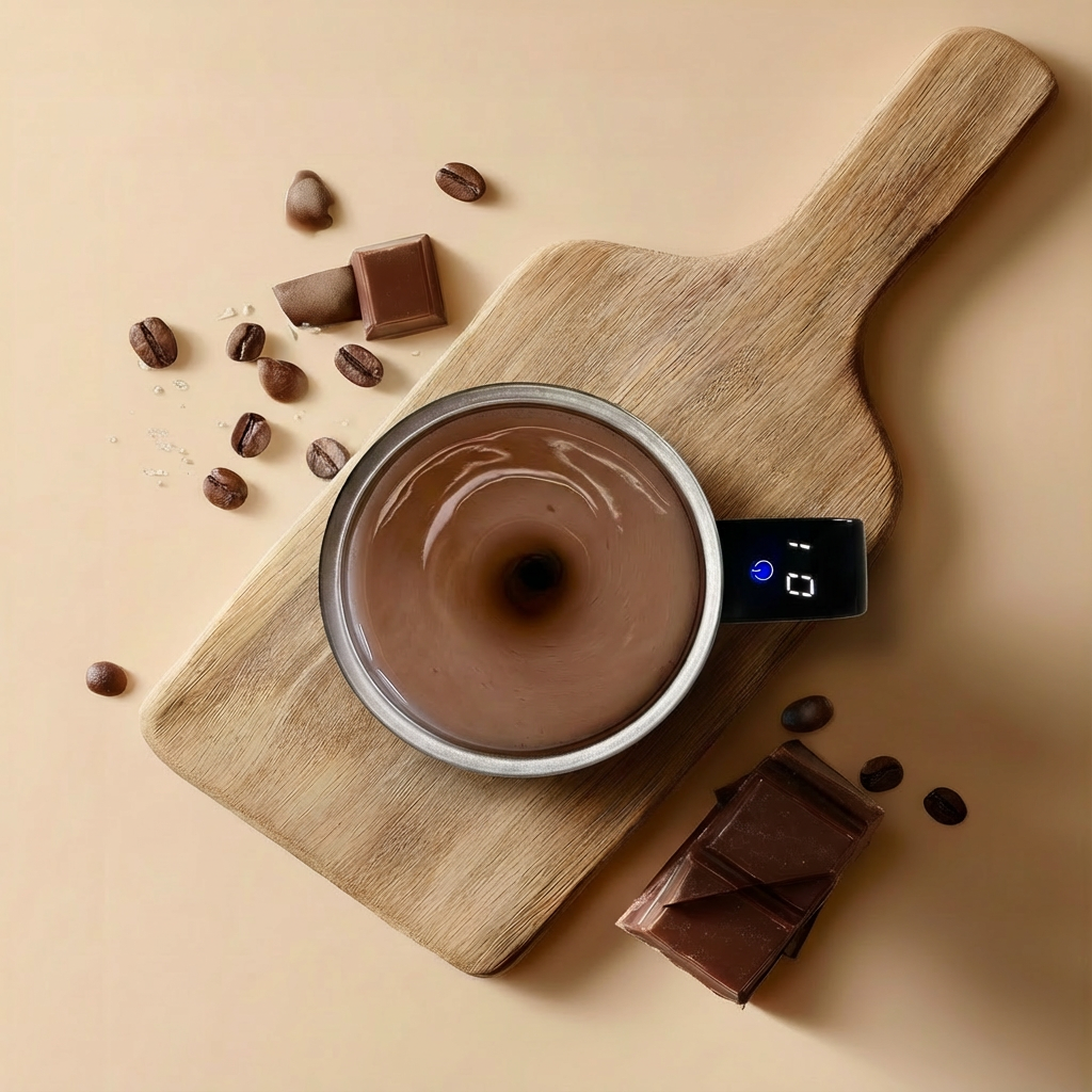 Our stainless steel mug blends any drink smoothly and effortlessly. It displays the current temperature so you never burn your tongue again. The mixing system works through a magnet at the bottom of the mug. With the included lid, you don’t have to worry about spills. And of course, it’s fully rechargeable.